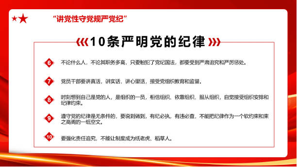 在随后的互动环节中,党员们踊跃发言,分享了自己对党纪党规的学习心得和体会,并结合典型案例深入剖析了违反党纪党规的严重后果,深化《中国共产党纪律处分条例》的理解运用,加强警示教育。纪检委员林子涵同志指出每一位支部党员都要做到学纪、知纪、明纪、守纪,明确党的纪律规矩,了解能做和不能做的事情,将遵规守纪内化为言行准则。支部成员吴修远同志表示通过此次学习,进一步增强了自己的纪律意识,明白了作为一名党员应该遵守的行为规范,将在今后的学习和生活中严格要求自己,时刻牢记党纪党规,做一名合格的共产党员。
